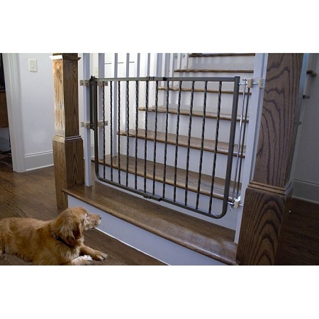 This attractive gate features a latch system that baffles toddlers and pets yet allows one hand operation for adults. The Decor Gate will mount at angles up to 30 degrees allowing location of a stud when mounting on drywall. Featuring durable steel construction and a powder-coated finish, the Wrought Iron Decor Gate is available in Bronze or Black.